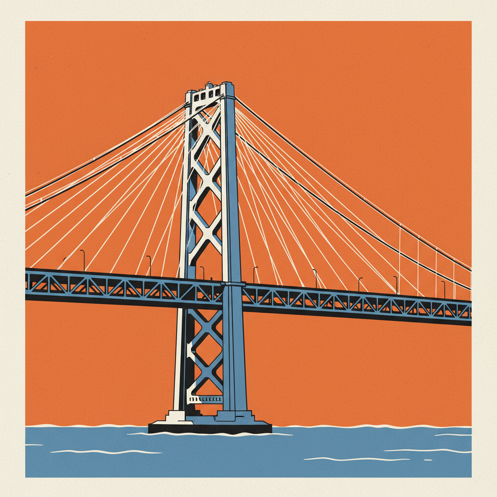 The eastern self-anchored suspension span, in heroic single-color pop.