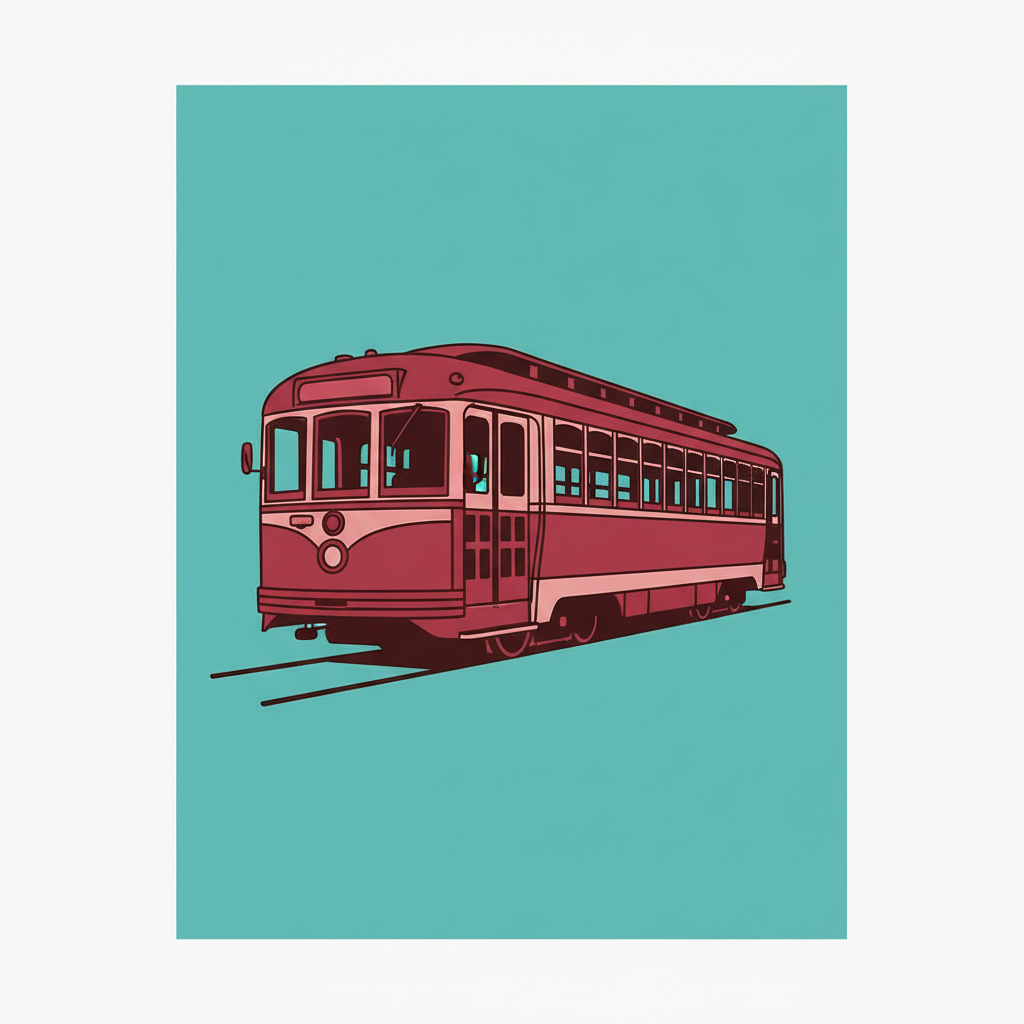 The historic F-Market streetcar in vintage maroon and cream — pop-art treatment.