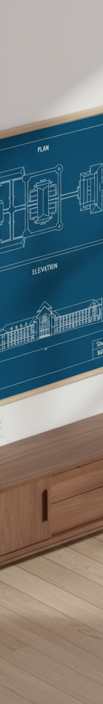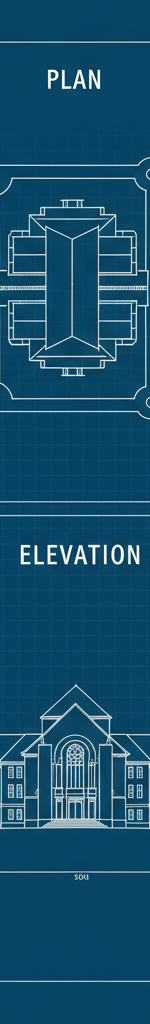 Memorial Quad with Memorial Church and Hoover Tower, drawn as a cyanotype.